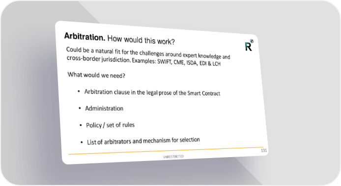 Arbitration. How would this work? Could be a natural fit for the challenges around expert knowledge and cross-border jurisdiction. Examples: SWIFT, CME, ISDA, EDI & LCH What would we need? • Arbitration clause in the legal prose of the Smart Contract • Administration • Policy / set of rules • List of arbitrators and mechanism for selection UNRESTRICTED 131