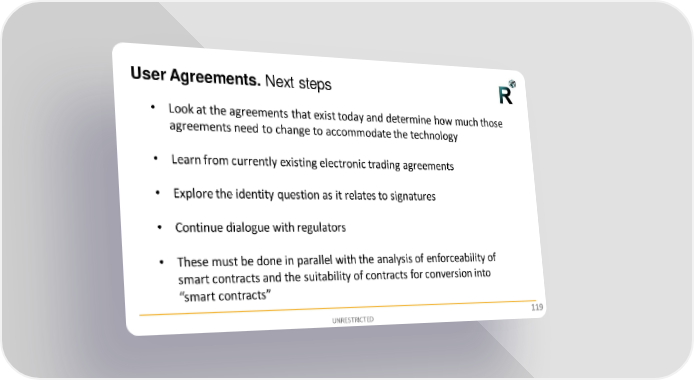 User Agreements. Next steps • Look at the agreements that exist today and determine how much those agreements need to change to accommodate the technology • Learn from currently existing electronic trading agreements • Explore the identity question as it relates to signatures • Continue dialogue with regulators • These must be done in parallel with the analysis of enforceability of smart contracts and the suitability of contracts for conversion into “smart contracts” UNRESTRICTED 119