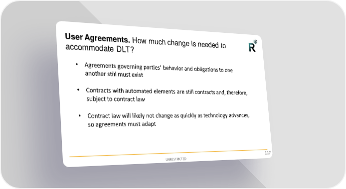 User Agreements. How much change is needed to accommodate DLT? • Agreements governing parties’ behavior and obligations to one another still must exist • Contracts with automated elements are still contracts and, therefore, subject to contract law • Contract law will likely not change as quickly as technology advances, so agreements must adapt UNRESTRICTED 117