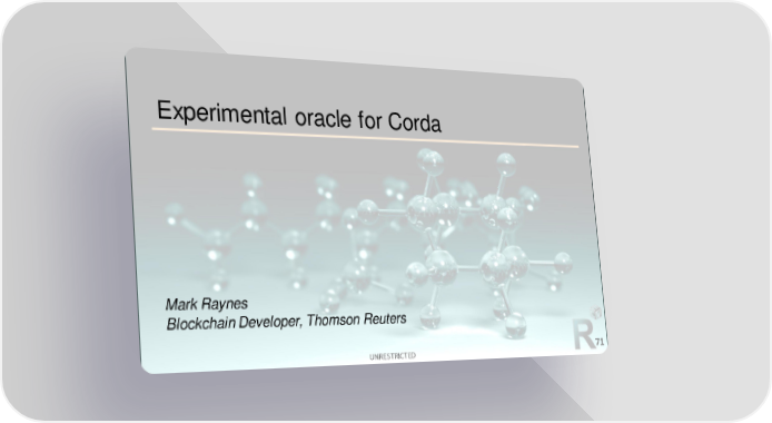 2nd R3 Smart Contract Templates Summit (All Slides) Page 71 Page 73Experimental oracle for Corda Mark Raynes Blockchain Developer, Thomson Reuters UNRESTRICTED 71