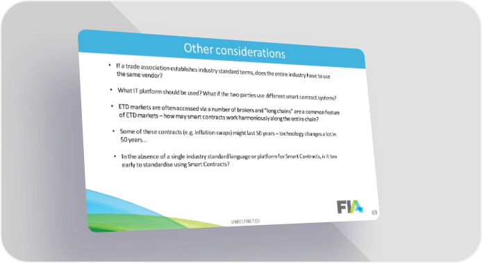 Other considerations • If a trade association establishes industry standard terms, does the entire industry have to use the same vendor? • What IT platform should be used? What if the two parties use different smart contract systems? • ETD markets are often accessed via a number of brokers and “long chains” are a common feature of ETD markets – how may smart contracts work harmoniously along the entire chain? • Some of these contracts (e.g. inflation swaps) might last 50 years – technology changes a lot in 50 years… • In the absence of a single industry standard language or platform for Smart Contracts, is it too early to standardise using Smart Contracts? UNRESTRICTED 69