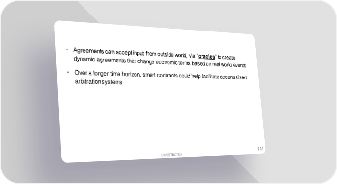 • Agreements can accept input from outside world, via “oracles” to create dynamic agreements that change economic terms based on real world events • Over a longer time horizon, smart contracts could help facilitate decentralized arbitration systems 141 UNRESTRICTED