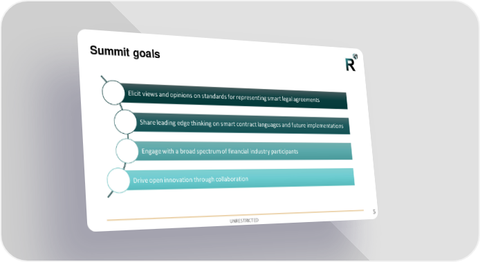 Summit goals Elicit views and opinions on standards for representing smart legal agreements Share leading edge thinking on smart contract languages and future implementations Engage with a broad spectrum of financial industry participants Drive open innovation through collaboration UNRESTRICTED 5