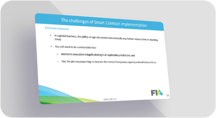 The challenges of Smart Contract implementation Electronic execution • In a global business, the ability to sign documents electronically may further reduce client on-boarding times • You still need to be comfortable that: o electronic execution is legally binding in all applicable jurisdictions; and o that the person purporting to execute the contract has power, capacity and authority to do so UNRESTRICTED 65