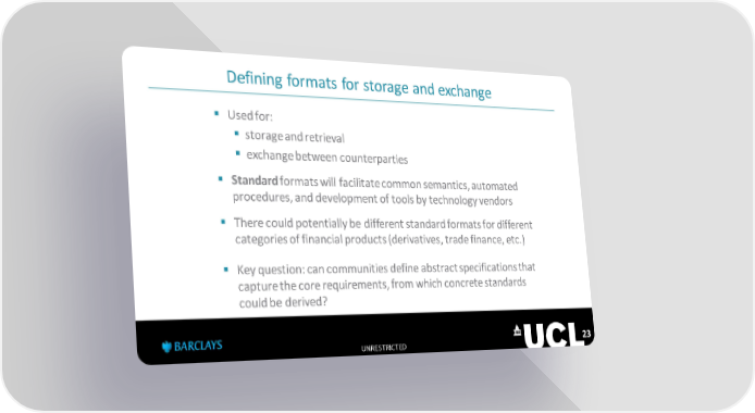 Defining formats for storage and exchange Used for: storage and retrieval exchange between counterparties Standard formats will facilitate common semantics, automated procedures, and development of tools by technology vendors There could potentially be different standard formats for different categories of financial products (derivatives, trade finance, etc.) Key question: can communities define abstract specifications that capture the core requirements, from which concrete standards could be derived? UNRESTRICTED 23