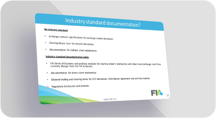 Industry standard documentation? No industry standard • Exchange contract specifications for exchange traded derivatives • Clearing House rules for cleared derivatives • Documentation for indirect client relationship Industry standard documentation exists • FIA Terms of Business and ancillary modules for clearing broker’s relationship with direct client (although most firms currently diverge from the FIA template) • Documentation for direct client relationship • Bilateral trading and clearing terms for OTC derivatives: ISDA Master Agreement and ancillary modules • Regulatory disclosures and annexes UNRESTRICTED 57