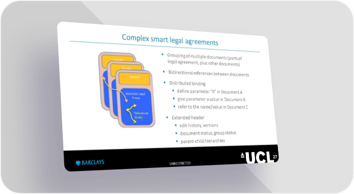 Complex smart legal agreements Grouping of multiple documents (parts of Header legal agreement, plus other documents) Header Bidirectional references between documents Legal Prose Header Distributed binding Legal Prose Extended Legal define parameter “X” in Document A References Prose (links) give parameter a value in Document B References (links) refer to the name/value in Document C References (links) Extended header edit history, versions document status, group status parent-child hierarchies UNRESTRICTED 27