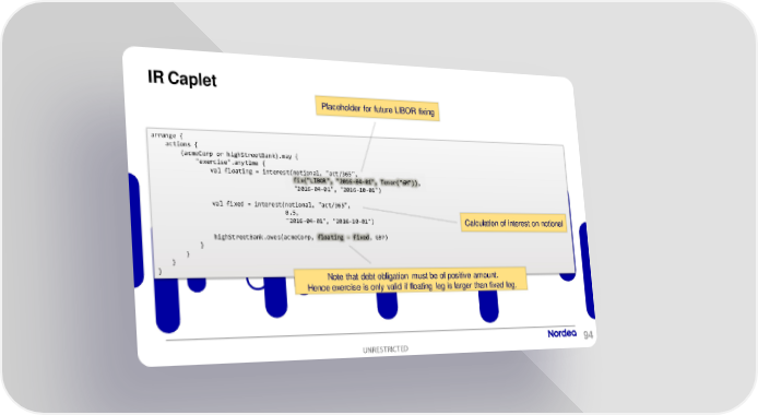 IR Caplet Placeholder for future LIBOR fixing arrange { actions { (acmeCorp or highStreetBank).may { "exercise".anytime { val floating = interest(notional, "act/365", fix("LIBOR", "2016-04-01", Tenor("6M")), "2016-04-01", "2016-10-01") val fixed = interest(notional, "act/365", 0.5, "2016-04-01", "2016-10-01") Calculation of interest on notional highStreetBank.owes(acmeCorp, floating - fixed, GBP) } } } } Note that debt obligation must be of positive amount. Hence exercise is only valid if floating leg is larger than fixed leg. UNRESTRICTED 94