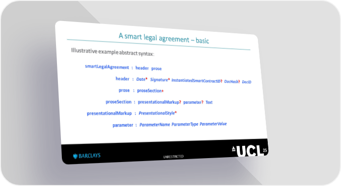 A smart legal agreement – basic Illustrative example abstract syntax: smartLegalAgreement : header prose header : Date* Signature* InstantiatedSmartContractID? DocHash? DocID prose : proseSection+ proseSection : presentationalMarkup? parameter? Text presentationalMarkup : PresentationalStyle* parameter : ParameterName ParameterType ParameterValue UNRESTRICTED 25