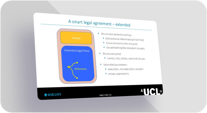 A smart legal agreement – extended Structured semantic markup Header bidirectional references (active links) clause semantics (for analysis) clause hashing (for standard clauses) Extended Legal Prose Structured prose names, lists, tables, optional clauses Extended parameters References execution, nonexecution, analytic arrays, expressions UNRESTRICTED 26
