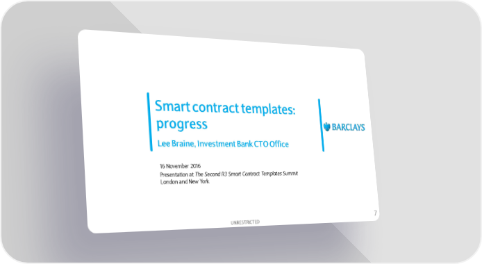 Smart contract templates: progress Lee Braine, Investment Bank CTO Office 16 November 2016 Presentation at The Second R3 Smart Contract Templates Summit London and New York UNRESTRICTED 7