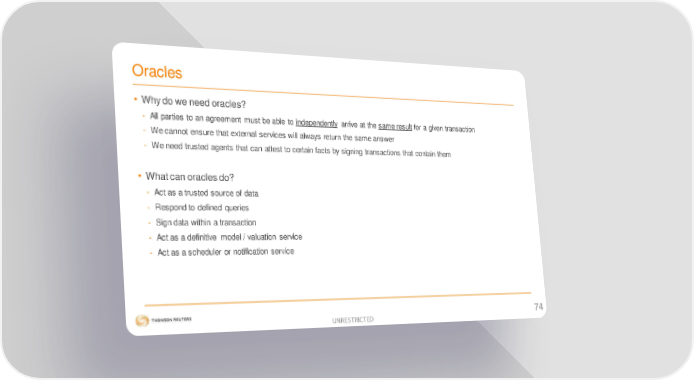 Oracles • Why do we need oracles? - All parties to an agreement must be able to independently arrive at the same result for a given transaction - We cannot ensure that external services will always return the same answer - We need trusted agents that can attest to certain facts by signing transactions that contain them • What can oracles do? - Act as a trusted source of data - Respond to defined queries - Sign data within a transaction - Act as a definitive model / valuation service - Act as a scheduler or notification service UNRESTRICTED 74