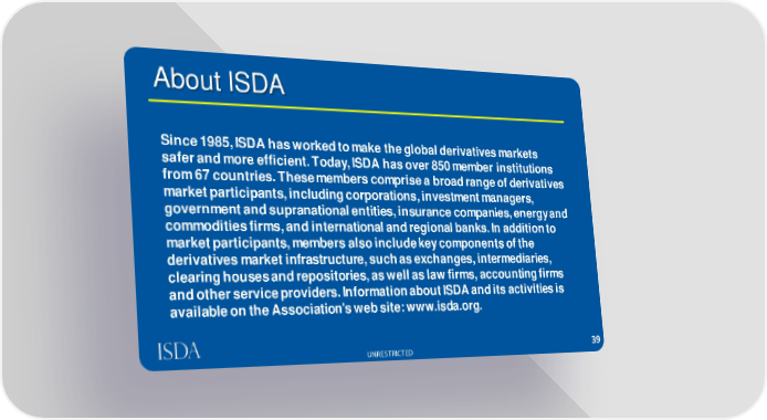About ISDA Since 1985, ISDA has worked to make the global derivatives markets safer and more efficient. Today, ISDA has over 850 member institutions from 67 countries. These members comprise a broad range of derivatives market participants, including corporations, investment managers, government and supranational entities, insurance companies, energy and commodities firms, and international and regional banks. In addition to market participants, members also include key components of the derivatives market infrastructure, such as exchanges, intermediaries, clearing houses and repositories, as well as law firms, accounting firms and other service providers. Information about ISDA and its activities is available on the Association's web site: www.isda.org. UNRESTRICTED 39