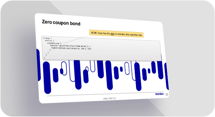 Zero coupon bond ACME Corp has the right to exercise after specified date arrange { actions { acmeCorp.may { "execute".givenThat(after("2018-06-01")) { highStreetBank.owes(acmeCorp, 100.K, GBP) } } } } UNRESTRICTED 92
