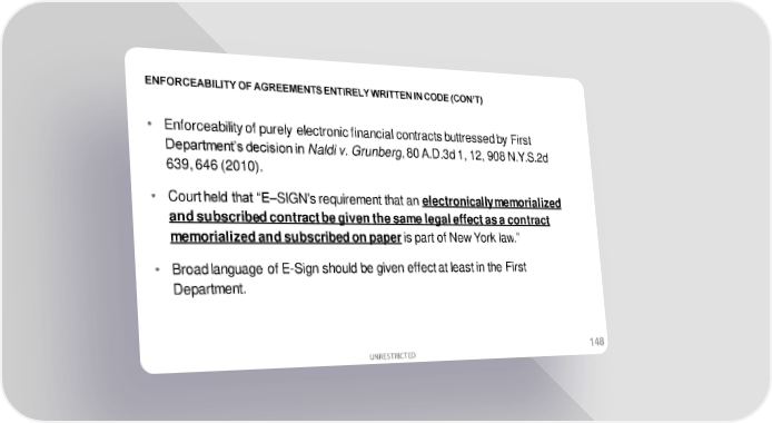 ENFORCEABILITY OF AGREEMENTS ENTIRELY WRITTEN IN CODE (CON’T) • Enforceability of purely electronic financial contracts buttressed by First Department’s decision in Naldi v. Grunberg, 80 A.D.3d 1, 12, 908 N.Y.S.2d 639, 646 (2010). • Court held that “E–SIGN's requirement that an electronically memorialized and subscribed contract be given the same legal effect as a contract memorialized and subscribed on paper is part of New York law.” • Broad language of E-Sign should be given effect at least in the First Department. 148 UNRESTRICTED