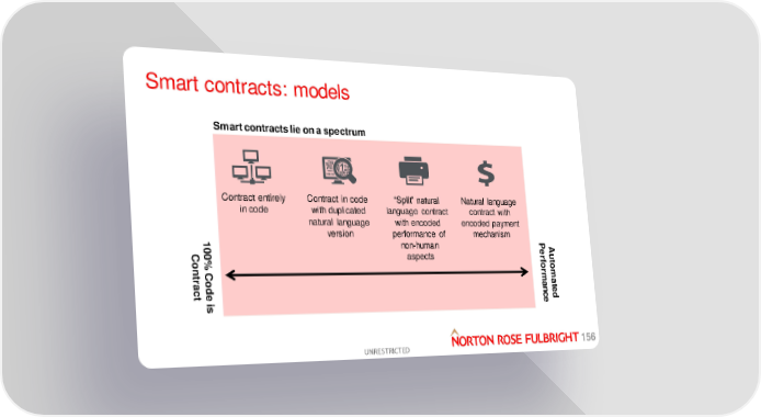 Smart contracts: models Smart contracts lie on a spectrum Contract entirely Contract in code “Split” natural Natural language in code with duplicated language contract contract with natural language with encoded encoded payment version performance of mechanism 100% non-human Pe Autom Contract aspects rforma Code n ed at is ec UNRESTRICTED 156