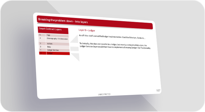 Breaking the problem down – into layers Smart Contract Layers Layer 0 – Ledger 5 Tags An off-the-shelf unmodified ledger implementation. Could be Etherium, Corda etc... 4 Choreography / Orchestration 3 Actions Technically, this does not need to be a ledger, but merely a networked data store; the 2 Data Ledger Services layer would then have to implement all missing 'Ledger-like’ functionality 1 Ledger Services 0 Ledger UNRESTRICTED 107