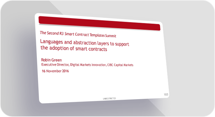 The Second R3 Smart Contract Templates Summit Languages and abstraction layers to support the adoption of smart contracts Robin Green Executive Director, Digital Markets Innovation, CIBC Capital Markets 16 November 2016 UNRESTRICTED 103