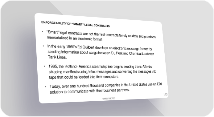 ENFORCEABILITY OF “SMART” LEGAL CONTRACTS • “Smart” legal contracts are not the first contracts to rely on data and promises memorialized in an electronic format • In the early 1960’s Ed Guilbert develops an electronic message format for sending information about cargo between Du Pont and Chemical Leahman Tank Lines. • 1965, the Holland- America steamship line begins sending trans-Atlantic shipping manifests using telex messages and converting the messages into tape that could be loaded into their computers • Today, over one hundred thousand companies in the United States use an EDI solution to communicate with their business partners. UNRESTRICTED 143