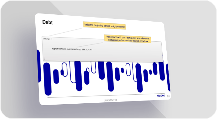 Debt Indicates beginning of light weight contract “highStreetBank” and “acmeCorp” are references arrange { to involved parties and are defined elsewhere highStreetBank.owes(acmeCorp, 100.K, GBP) } UNRESTRICTED 91