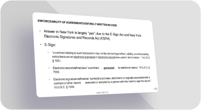 ENFORCEABILITY OF AGREEMENTS ENTIRELY WRITTEN IN CODE • Answer in New York is largely “yes”; due to the E-Sign Act and New York Electronic Signatures and Records Act (ESRA) • E-Sign: • “a contract relating to such transaction may not be denied legal effect, validity, or enforceability solely because an electronic signature or electronic record was used in its formation.” 15 U.S.C. § 7001. • Electronic record defined as a “a contract . . . .generated . . . by electronic means.” 15 U.S.C. § 7006. • Electronic signature defined as “symbol[] or process, attached to or logically associated with a contract or other record . . . executed or adopted by a person with the intent to sign the record.” 15 U.S.C. § 7006. UNRESTRICTED 145