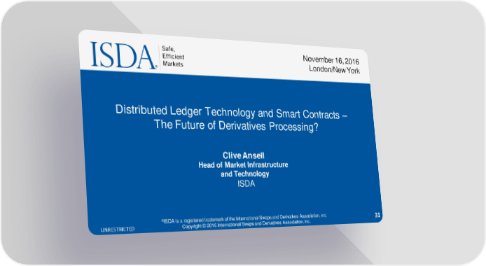 November 16, 2016 London/New York Distributed Ledger Technology and Smart Contracts – The Future of Derivatives Processing? Clive Ansell Head of Market Infrastructure and Technology ISDA ®ISDA is a registered trademark of the International Swaps and Derivatives Association, Inc. 31 UNRESTRICTED Copyright © 2016 International Swaps and Derivatives Association, Inc.