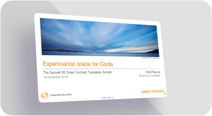 2nd R3 Smart Contract Templates Summit (All Slides) Page 72 Page 74Experimental oracle for Corda The Second R3 Smart Contract Templates Summit Mark Raynes 16 November 2016 Blockchain Developer Applied Innovation UNRESTRICTED 72