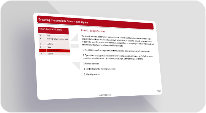 Breaking the problem down – into layers Smart Contract Layers Layer 1 - Ledger Services 5 Tags The smart contract code will require some base functionality to operate - this could either 4 Choreography / Orchestration be provided natively by the ledger, or by trusted third parties that provide services on the ledger (the specific service provider could be specified as an input parameter in the contract 3 Actions definition). This functionality would likely include: 2 Data 1. The ability to enforce a guaranteed and provable state across multiple participants 1 Ledger Services 0 Ledger 2. Operations to support transactions between autonomous actors, e.g., ‘only do x when condition y has been met’. (Consensus, Notary & Semaphoring operations) 3. Escrow services 4. Content agnostic messaging service 5. Identity services UNRESTRICTED 108