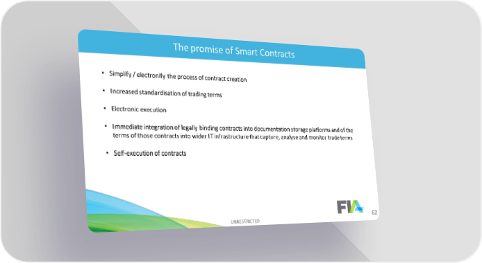 The promise of Smart Contracts • Simplify / electronify the process of contract creation • Increased standardisation of trading terms • Electronic execution • Immediate integration of legally binding contracts into documentation storage platforms and of the terms of those contracts into wider IT infrastructure that capture, analyse and monitor trade terms • Self-execution of contracts UNRESTRICTED 62