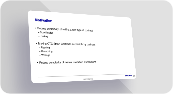 Motivation • Reduce complexity of writing a new type of contract – Specification – Testing • Making OTC Smart Contracts accessible by business – Reading – Reasoning – Writing? • Reduce complexity of manual validation transactions UNRESTRICTED 86