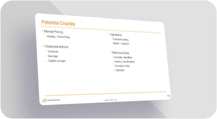 Potential Oracles • Market Pricing • Valuations - Intraday / End-of-Day - Evaluated pricing - Models / Analytics • Corporate Actions - Dividends • Reference Data - Earnings - Symbols / Identifiers - Capital changes - Industry classifications - Descriptive data - Calendars UNRESTRICTED 79