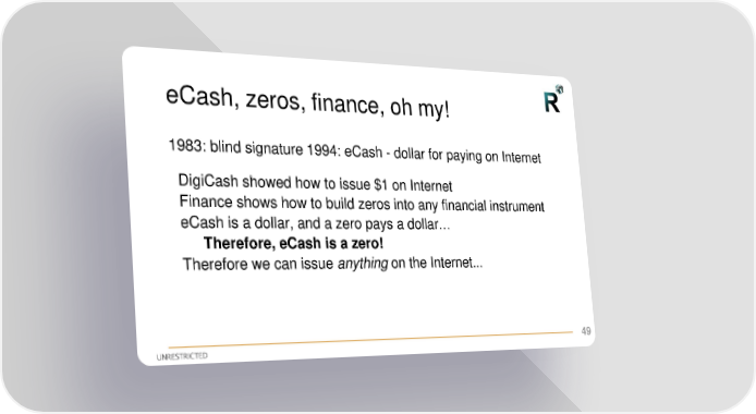 eCash, zeros, finance, oh my! 1983: blind signature 1994: eCash - dollar for paying on Internet DigiCash showed how to issue $1 on Internet Finance shows how to build zeros into any financial instrument eCash is a dollar, and a zero pays a dollar… Therefore, eCash is a zero! Therefore we can issue anything on the Internet... 49