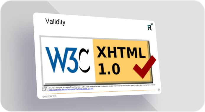 Validity XHTML : This file is ineligible for copyright and therefore in the public domain because it consists entirely of information that is common property and contains no original authorship Credit to https://commons.wikimedia.org/wiki/File:Valid_XHTML_1.0.svg 84
