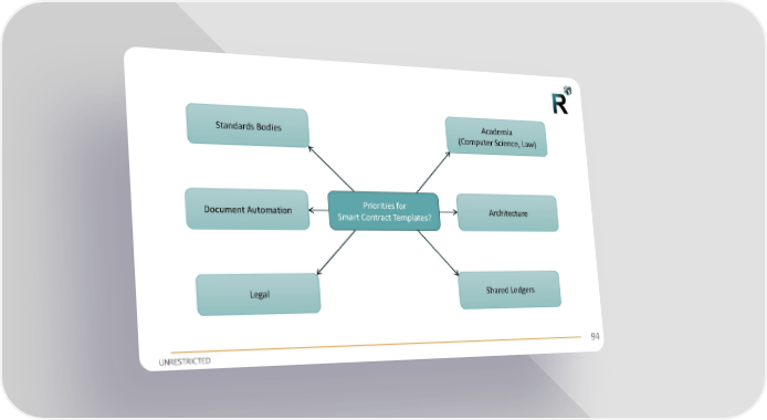 First R3 Smart Contract Templates Summit (All Slides) Page 93 Page 95Standards Bodies Academia (Computer Science, Law) Document Automation Priorities for Architecture Smart Contract Templates? Legal Shared Ledgers 94