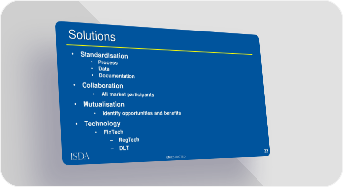 Solutions • Standardisation • Process • Data • Documentation • Collaboration • All market participants • Mutualisation • Identify opportunities and benefits • Technology • FinTech – RegTech – DLT 22