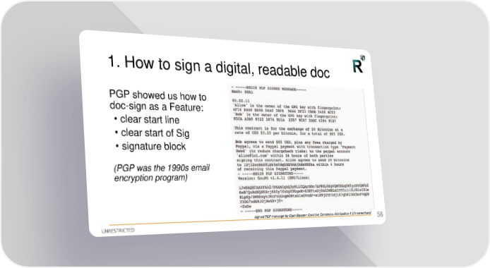 1. How to sign a digital, readable doc PGP showed us how to doc-sign as a Feature: • clear start line • clear start of Sig • signature block (PGP was the 1990s email encryption program) signed PGP message by OpenBazaar: Creative Commons Attribution 4.0 International 56