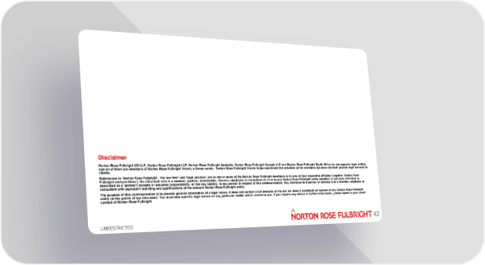 Disclaimer Norton Rose Fulbright US LLP, Norton Rose Fulbright LLP, Norton Rose Fulbright Australia, Norton Rose Fulbright Canada LLP and Norton Rose Fulbright South Africa Inc are separate legal entities and all of them are members of Norton Rose Fulbright Verein, a Swiss verein. Norton Rose Fulbright Verein helps coordinate the activities of the members but does not itself provide legal services to clients. References to ‘Norton Rose Fulbright’, ‘the law firm’ and ‘legal practice’ are to one or more of the Norton Rose Fulbright members or to one of their respective affiliates (together ‘Norton Rose Fulbright entity/entities’). No individual who is a member, partner, shareholder, director, employee or consultant of, in or to any Norton Rose Fulbright entity (whether or not such individual is described as a ‘partner’) accepts or assumes responsibility, or has any liability, to any person in respect of this communication. Any reference to a partner or director is to a member, employee or consultant with equivalent standing and qualifications of the relevant Norton Rose Fulbright entity. The purpose of this communication is to provide general information of a legal nature. It does not contain a full analysis of the law nor does it constitute an opinion of any Norton Rose Fulbright entity on the points of law discussed. You must take specific legal advice on any particular matter which concerns you. If you require any advice or further information, please speak to your usual contact at Norton Rose Fulbright. 42