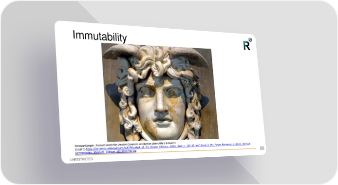 Immutability Medusa Gorgon : licensed under the Creative Commons Attribution-Share Alike 2.0 Generic Credit to https://commons.wikimedia.org/wiki/File:Mask_of_the_Gorgon_Medusa,_dating_from_c._130_AD_and_found_in_the_Forum_Romanum_in_Rome,_Romisch- Germanisches_Museum,_Cologne_(8115605754).jpg 86