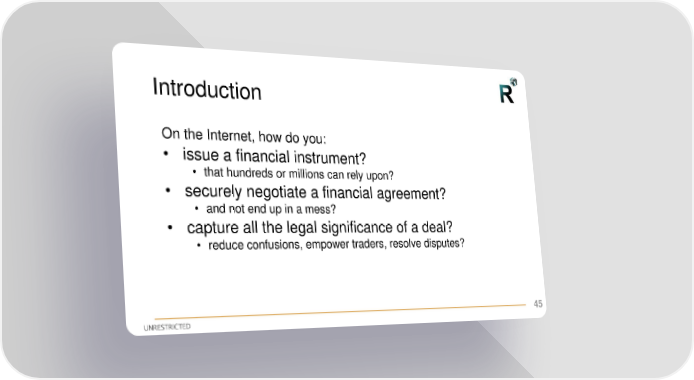 Introduction On the Internet, how do you: • issue a financial instrument? • that hundreds or millions can rely upon? • securely negotiate a financial agreement? • and not end up in a mess? • capture all the legal significance of a deal? • reduce confusions, empower traders, resolve disputes? 45