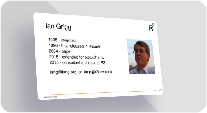 Ian Grigg 1995 - invented 1996 - first released in Ricardo 2004 - paper 2015 - extended for blockchains 2015 - consultant architect at R3 [email protected] or [email protected] 47