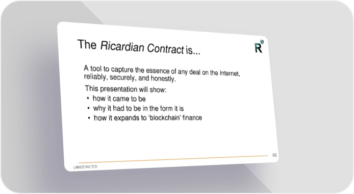 The Ricardian Contract is... A tool to capture the essence of any deal on the Internet, reliably, securely, and honestly. This presentation will show: • how it came to be • why it had to be in the form it is • how it expands to ‘blockchain’ finance 46