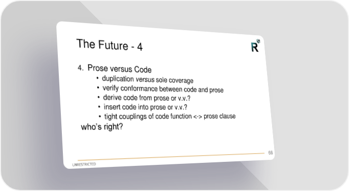 The Future - 4 4. Prose versus Code • duplication versus sole coverage • verify conformance between code and prose • derive code from prose or v.v.? • insert code into prose or v.v.? • tight couplings of code function <-> prose clause who’s right? 66