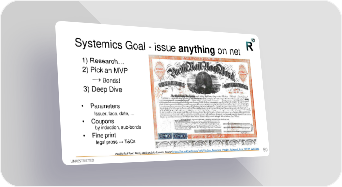 Systemics Goal - issue anything on net 1) Research… 2) Pick an MVP → Bonds! 3) Deep Dive • Parameters Issuer, face, date, … • Coupons by induction, sub-bonds • Fine print legal prose → T&Cs Pacific Rail Road Bond, 1865: public domain. Source https://en.wikipedia.org/wiki/File:San_Francisco_Pacific_Railroad_Bond_WPRR_1865.jpg 50