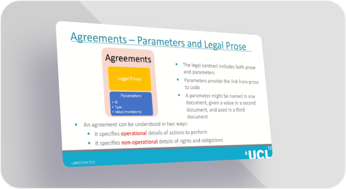 Agreements – Parameters and Legal Prose The legal contract includes both prose and parameters Parameters provide the link from prose to code A parameter might be named in one document, given a value in a second document, and used in a third document An agreement can be understood in two ways: it specifies operational details of actions to perform it specifies non-operational details of rights and obligations 72