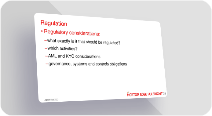 Regulation • Regulatory considerations: –what exactly is it that should be regulated? –which activities? –AML and KYC considerations –governance, systems and controls obligations 39