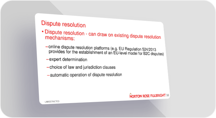 Dispute resolution • Dispute resolution - can draw on existing dispute resolution mechanisms: –online dispute resolution platforms (e.g. EU Regulation 524/2013 provides for the establishment of an EU-level model for B2C disputes) –expert determination –choice of law and jurisdiction clauses –automatic operation of dispute resolution 38