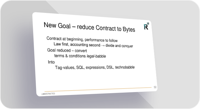 New Goal – reduce Contract to Bytes Contract at beginning, performance to follow Law first, accounting second → divide and conquer Goal reduced – convert terms & conditions legal-babble Into Tag-values, SQL, expressions, DSL, technobabble 52
