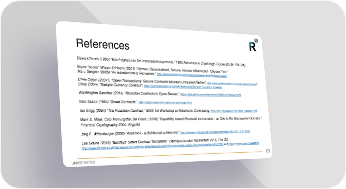 References David Chaum (1983) "Blind signatures for untraceable payments," 1983 Advances in Cryptology, Crypto 82 (3): 199–203. Bryce “zooko” Wilcox-O’Hearn (2001) “Names: Decentralized, Secure, Human-Meaningful - Choose Two.” Marc Steigler (2005) “An Introduction to Petnames,” http://www.skyhunter.com/marcs/petnames/IntroPetNames.html Chris Odom (200x?) "Open-Transactions: Secure Contracts between Untrusted Parties", http://www.opentransactions.org/open-transactions.pdf Chris Odom, "Sample Currency Contract", http://opentransactions.org/wiki/index.php/Sample_Currency_Contract Washington Sanchez (2014) “Ricardian Contracts in Open Bazaar,” https://gist.github.com/drwasho/a5380544c170bdbbbad8 Nick Szabo (1994) “Smart Contracts”, http://szabo.best.vwh.net/smart.contracts.html Ian Grigg (2004) “The Ricardian Contract,” IEEE 1st Workshop on Electronic Contracting, http://iang.org/papers/ricardian_contract.html Mark S. Miller, Chip Morningstar, Bill Franz, (2000) “Capability-based Financial Instruments - an Ode to the Granovetter Operator.” Financial Cryptography 2000, Anguilla Jörg F. Wittenberger (2002) “Askemos - a distributed settlement,“ http://citeseerx.ist.psu.edu/viewdoc/summary?doi=10.1.1.11.5050 Lee Braine (2016) “Barclays’ Smart Contract Templates,” Barclays London Accelerator 2016, The O2, http://www.ibtimes.co.uk/barclays-smart-contract-templates-heralds-first-ever-public-demo-r3s-corda-platform-1555329 and https://vimeo.com/168844103 67