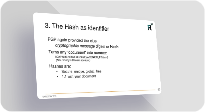 3. The Hash as identifier PGP again provided the clue cryptographic message digest or Hash Turns any ‘document’ into number: 1Q2TWHE3GMdB6BZKafqwxXtWAWgFt5Jvm3 (Hal Finney’s Bitcoin account) Hashes are: • Secure, unique, global, free • 1:1 with your document 60